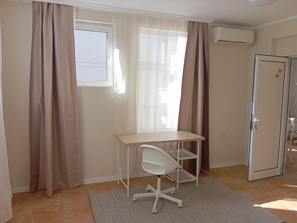 one bedroom apartment located on the third floor in Levski. The building is meters away from the Saint Marina Hospital, the Technical University of Varna, a Lidl shopping center and public transport stops. The apartment consists of a spacious living-room with a kitchen part, bedroom, bathroom and a toilet room. The residence is fully furnished and equipped.